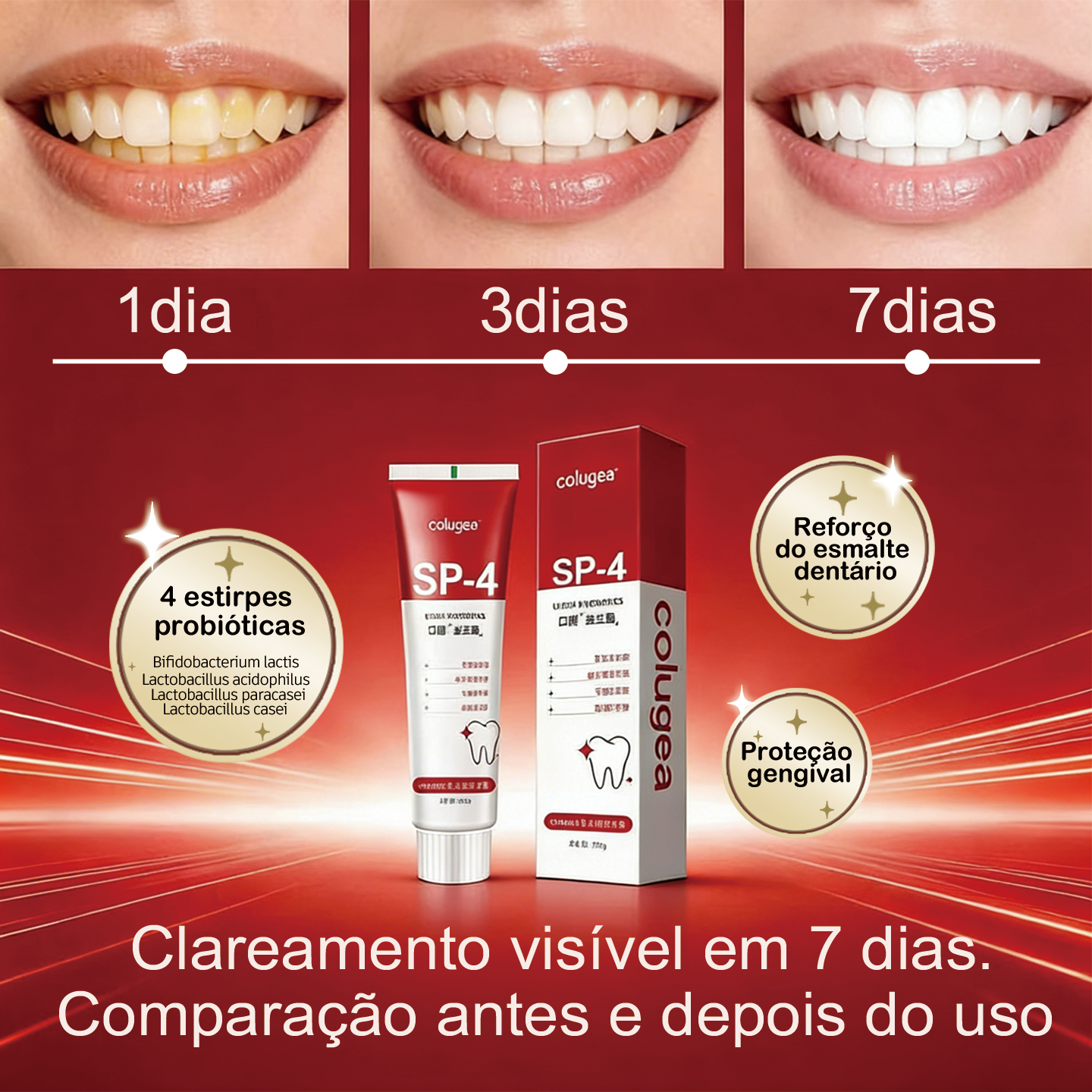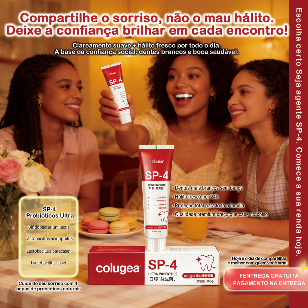 Produto: Pasta de dentes probiótica SP-4 ColugeaConteúdo: 100gTipo: Creme dental clareador com probióticosUso: Higiene bucal diária, clareamento, proteção gengival e hálito fresco